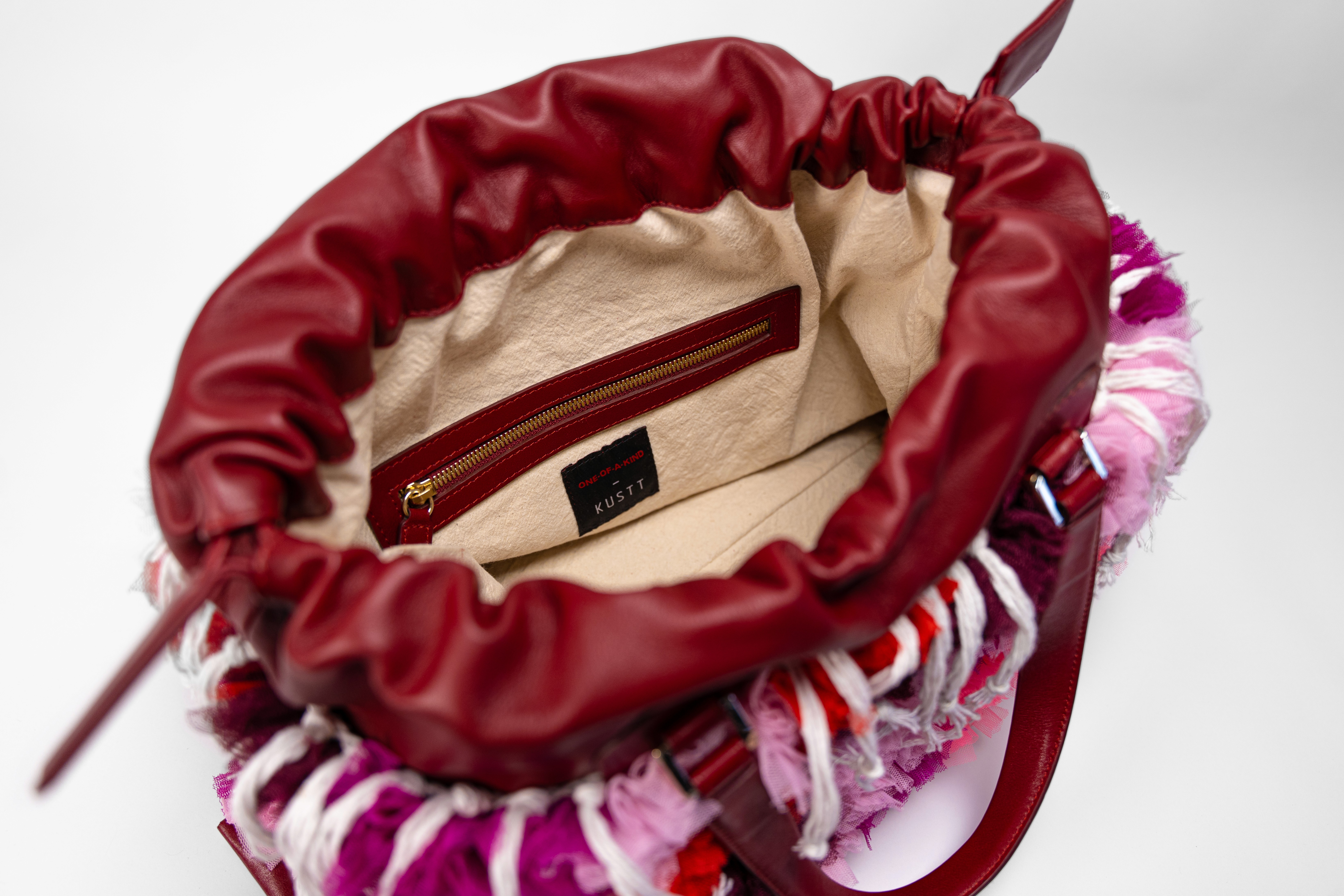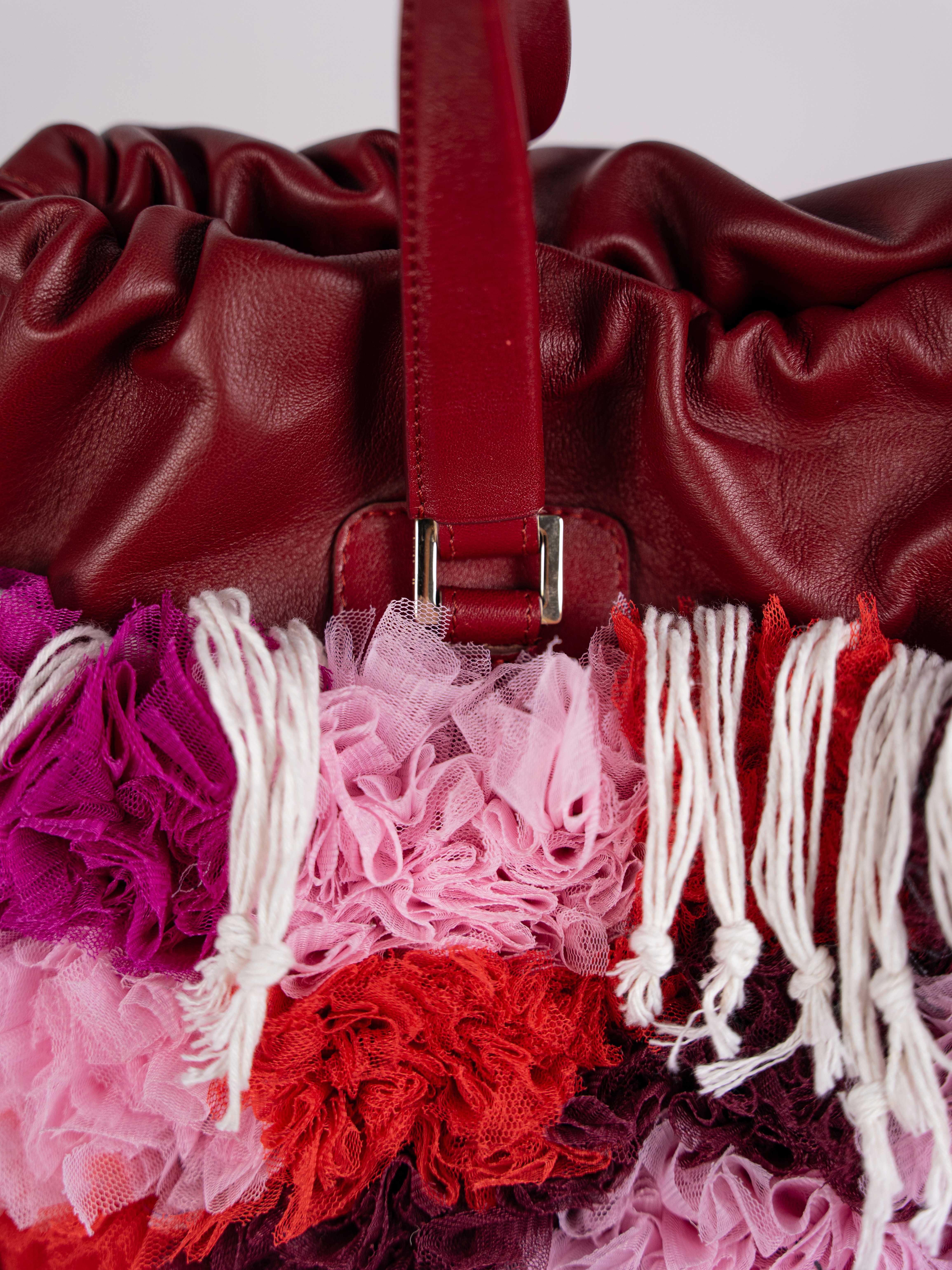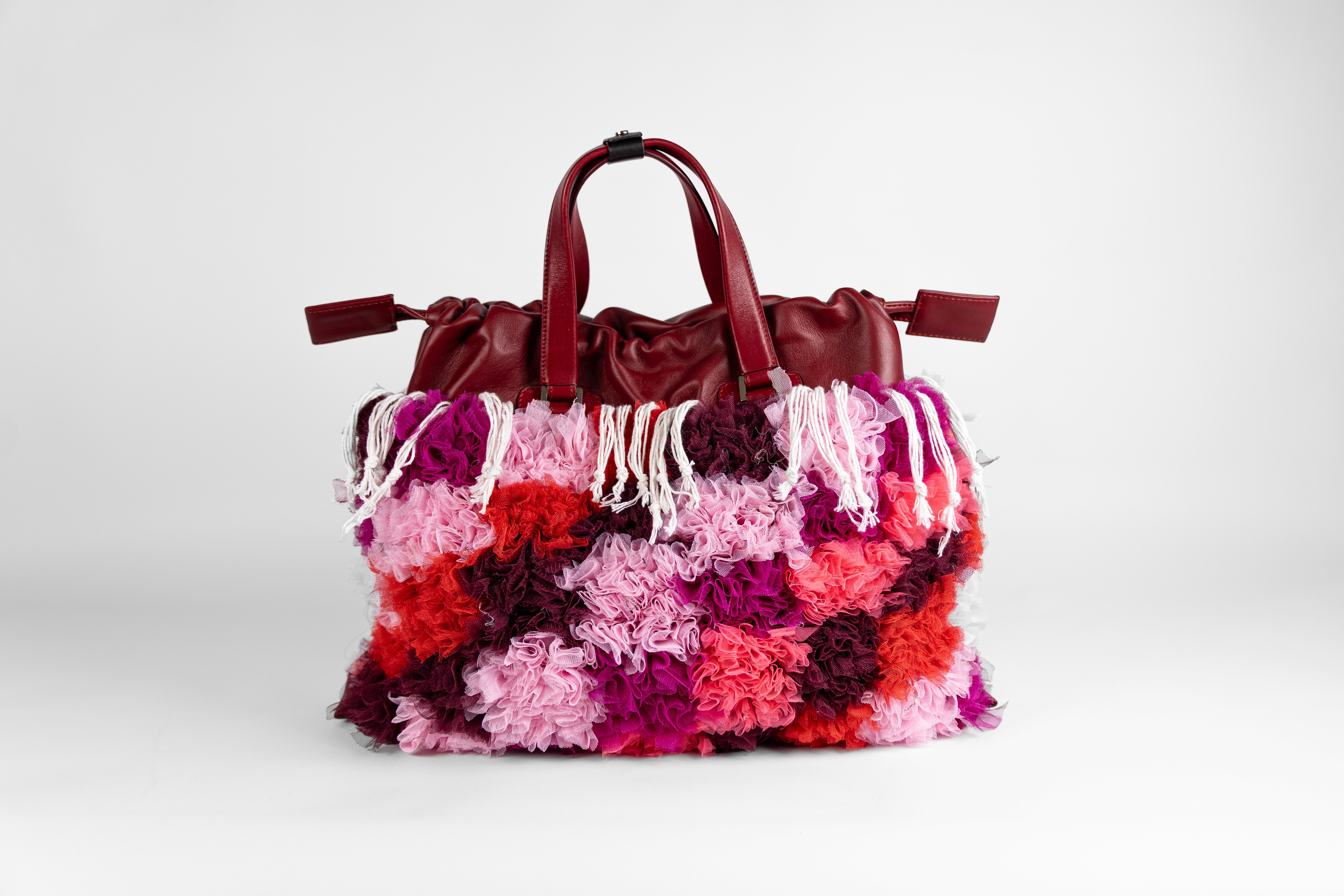 MATERIAL: Layered tulles in shades of pinks and deep reds, crafted using the traditional Moroccan boucharouite knotting technique — typically used for rugs, here reimagined with leftover tulle to create a richly textured, almost sculptural surface. Top of the bag in soft deep red calf leather. Gold-tone hardware. Drawstring closure in Moroccan sabra cord (traditionally used for djellabas). Ecru cotton lining. DETAILS: Handcrafted knotting technique inspired by Moroccan boucharouite, giving each piece depth, volume, and a one-of-a-kind character. Interior zip pocket trimmed in leather to keep essentials secure. CARRIED: By hand or over the shoulder. DIMENSIONS: 440 x 320 x 65 mm WEIGHT: 1190 g