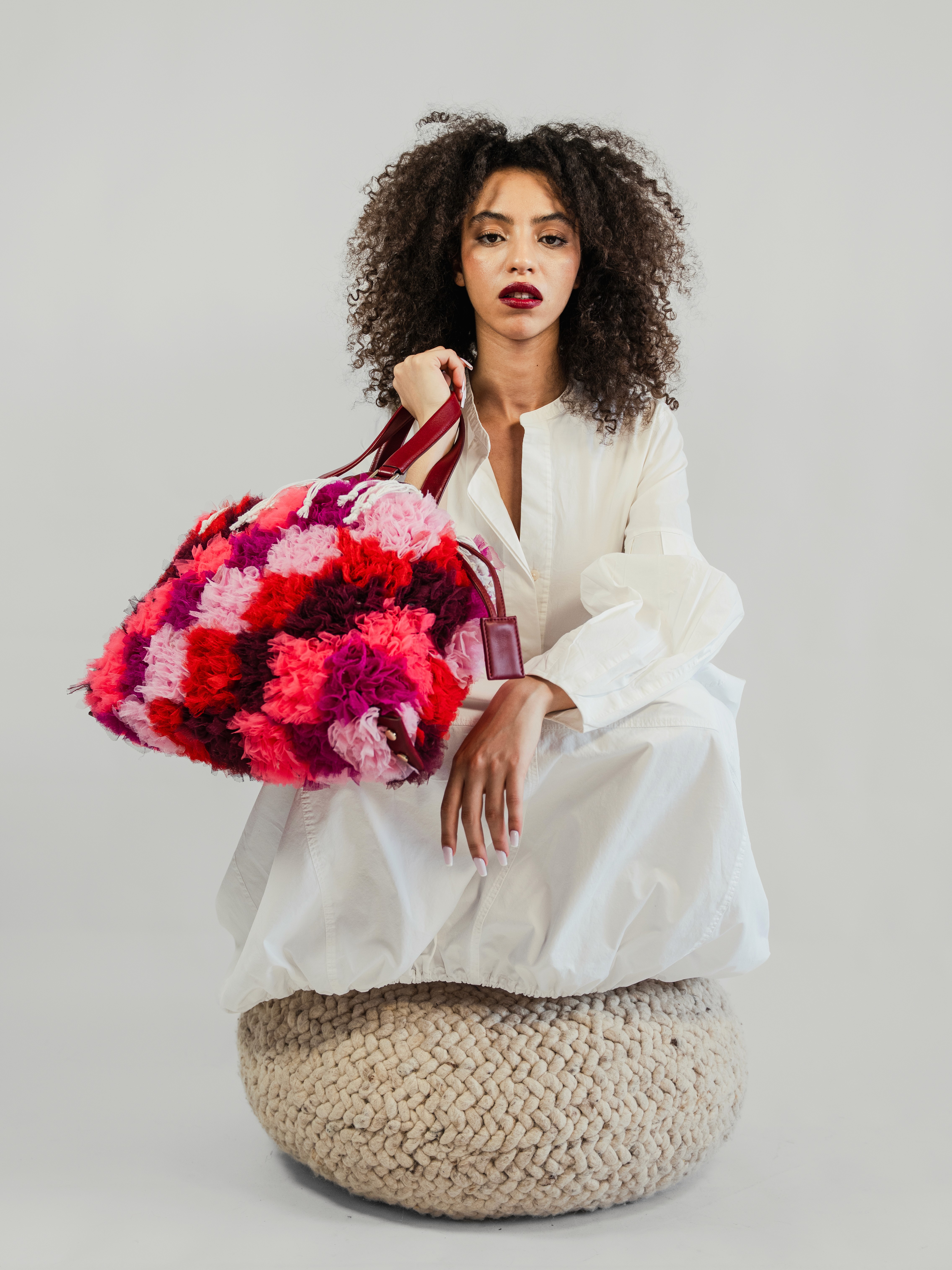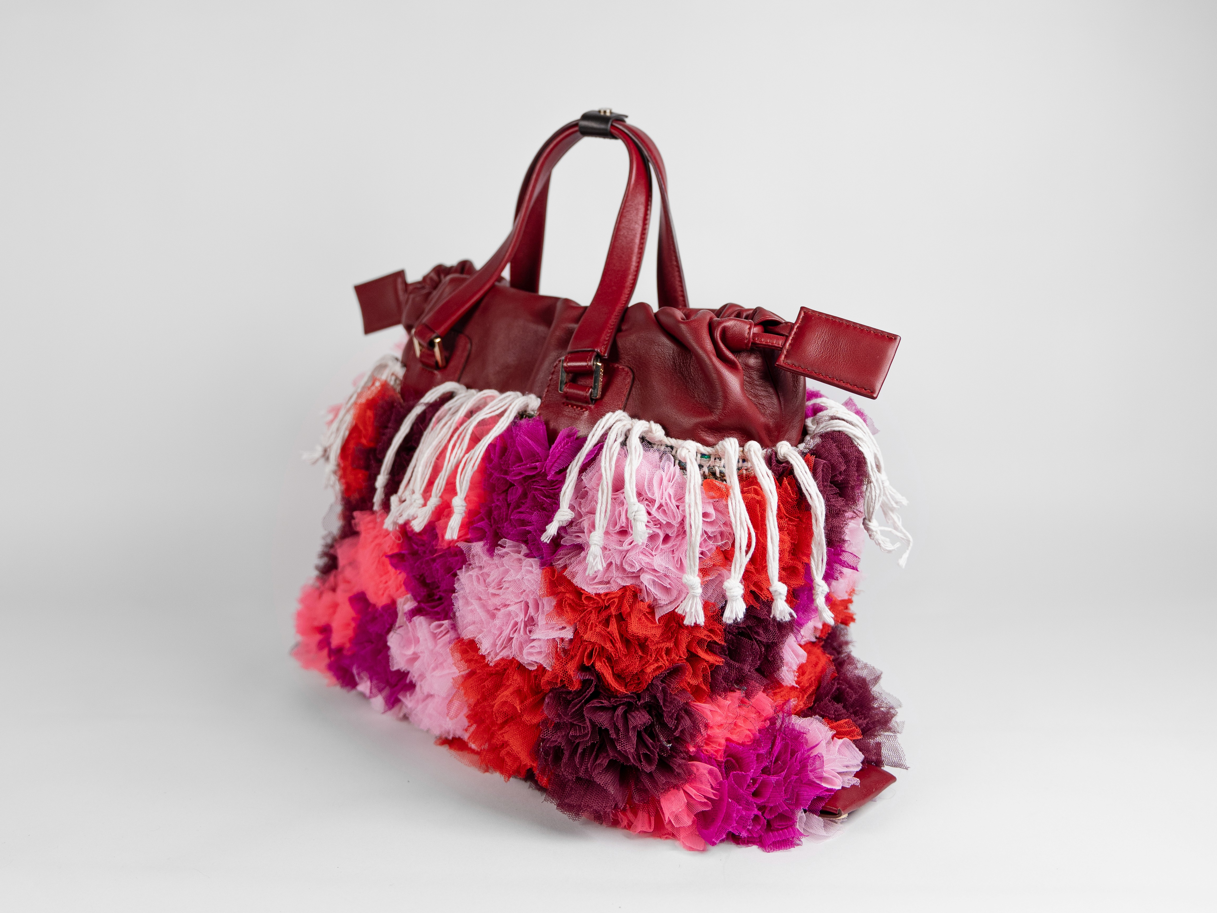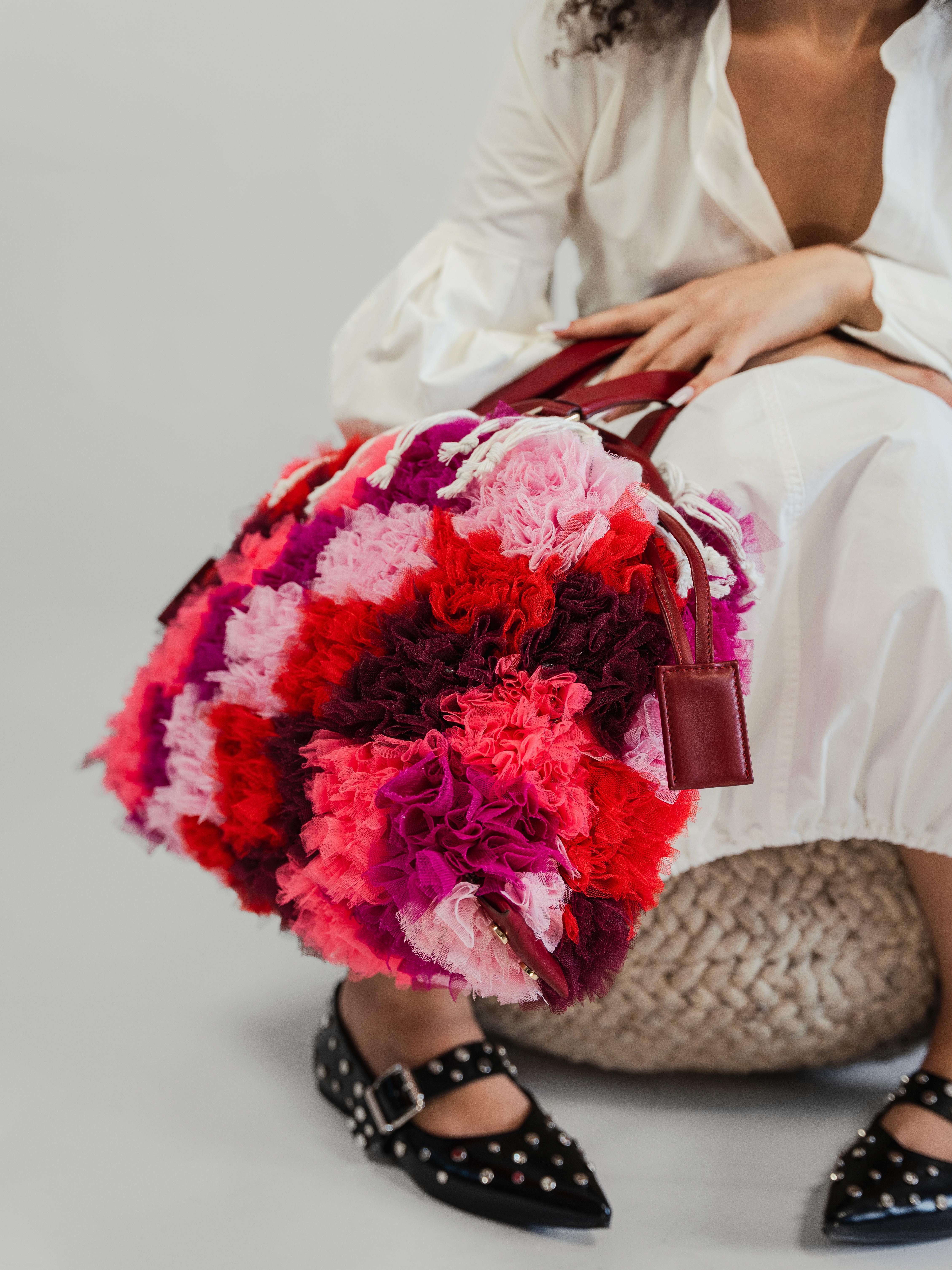 MATERIAL: Layered tulles in shades of pinks and deep reds, crafted using the traditional Moroccan boucharouite knotting technique — typically used for rugs, here reimagined with leftover tulle to create a richly textured, almost sculptural surface. Top of the bag in soft deep red calf leather. Gold-tone hardware. Drawstring closure in Moroccan sabra cord (traditionally used for djellabas). Ecru cotton lining. DETAILS: Handcrafted knotting technique inspired by Moroccan boucharouite, giving each piece depth, volume, and a one-of-a-kind character. Interior zip pocket trimmed in leather to keep essentials secure. CARRIED: By hand or over the shoulder. DIMENSIONS: 440 x 320 x 65 mm WEIGHT: 1190 g