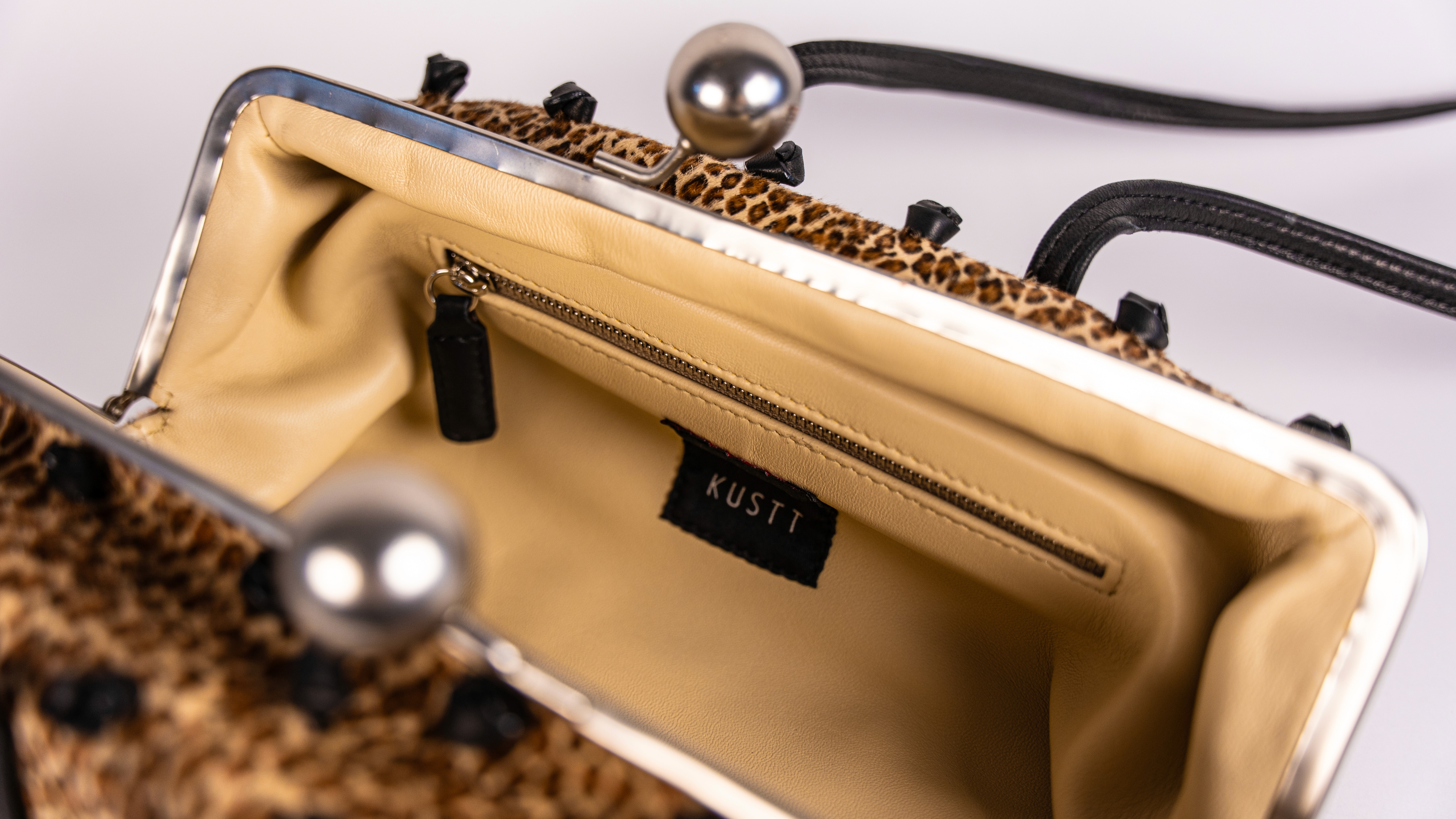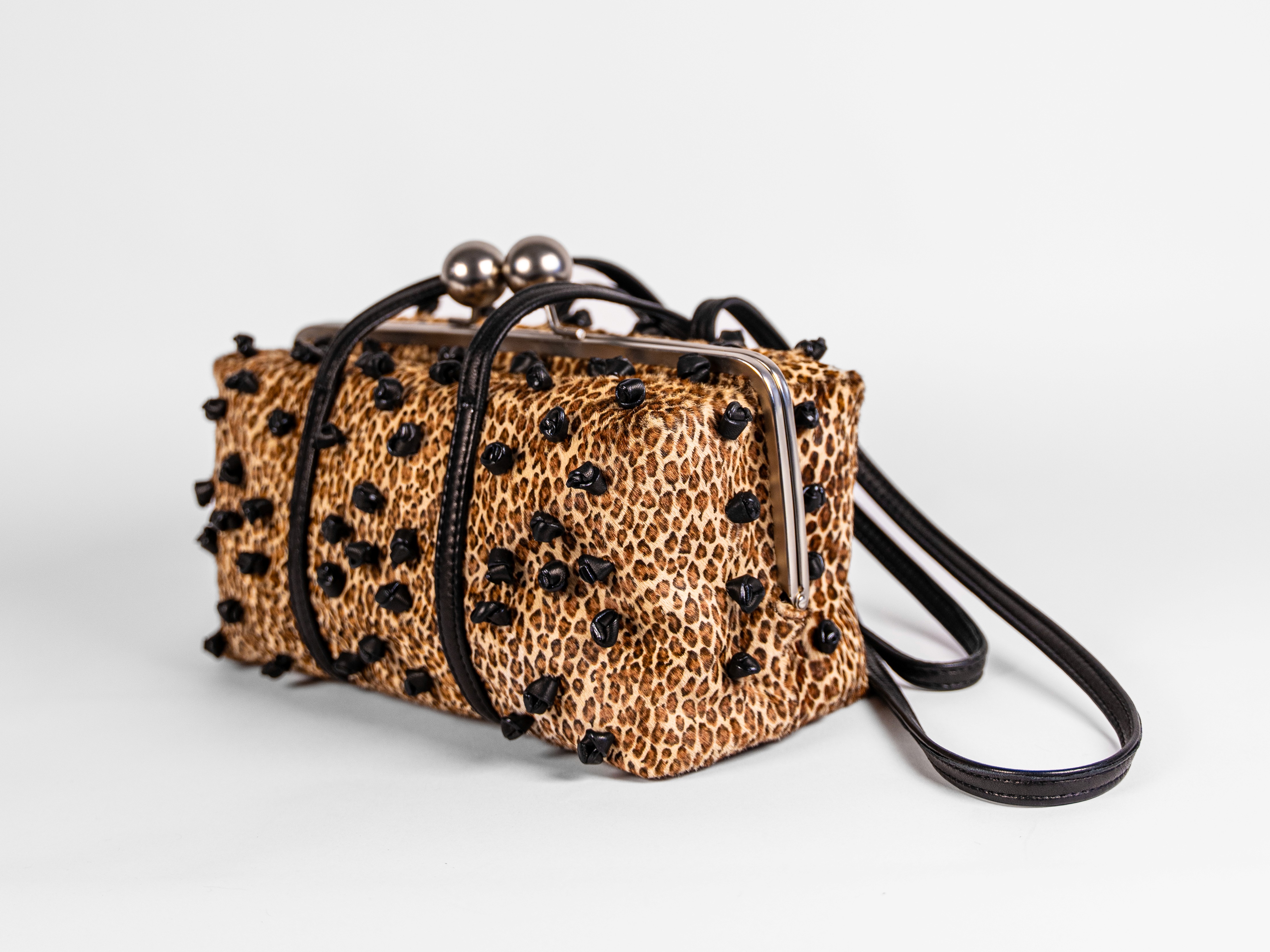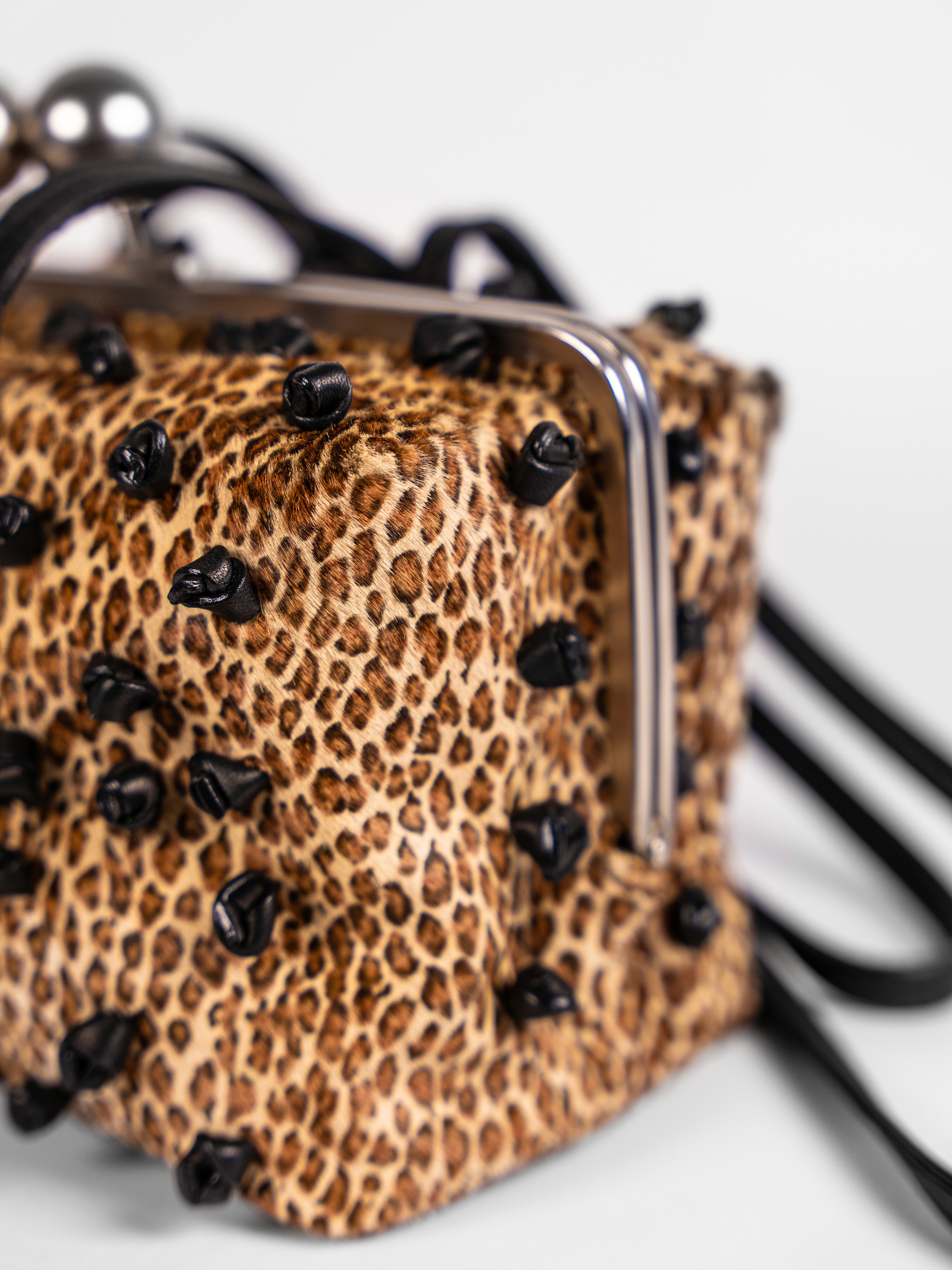 MATERIAL: Pony leather with a micro leopard print in shades of brown, black, and fawn. Adorned with hand-tied black nappa leather knots, each applied one by one, echoing the long, slim handles. Semi-matte silver-tone metal clasp with oversized spheres. Protective silver-tone metal feet at the base. Ecru nappa leather lining with a patch interior pocket. DETAILS: Structured yet supple silhouette, balancing definition and softness. Signature kiss-lock closure crowned with two oversized spheres, allowing the bag to be effortlessly grabbed in one swift gesture. Long, fine shoulder straps for an elongated, elegant carry. CARRIED: Worn over the shoulder with a long drop. DIMENSIONS: 280x 160 x 120 cm WEIGHT: 900gr