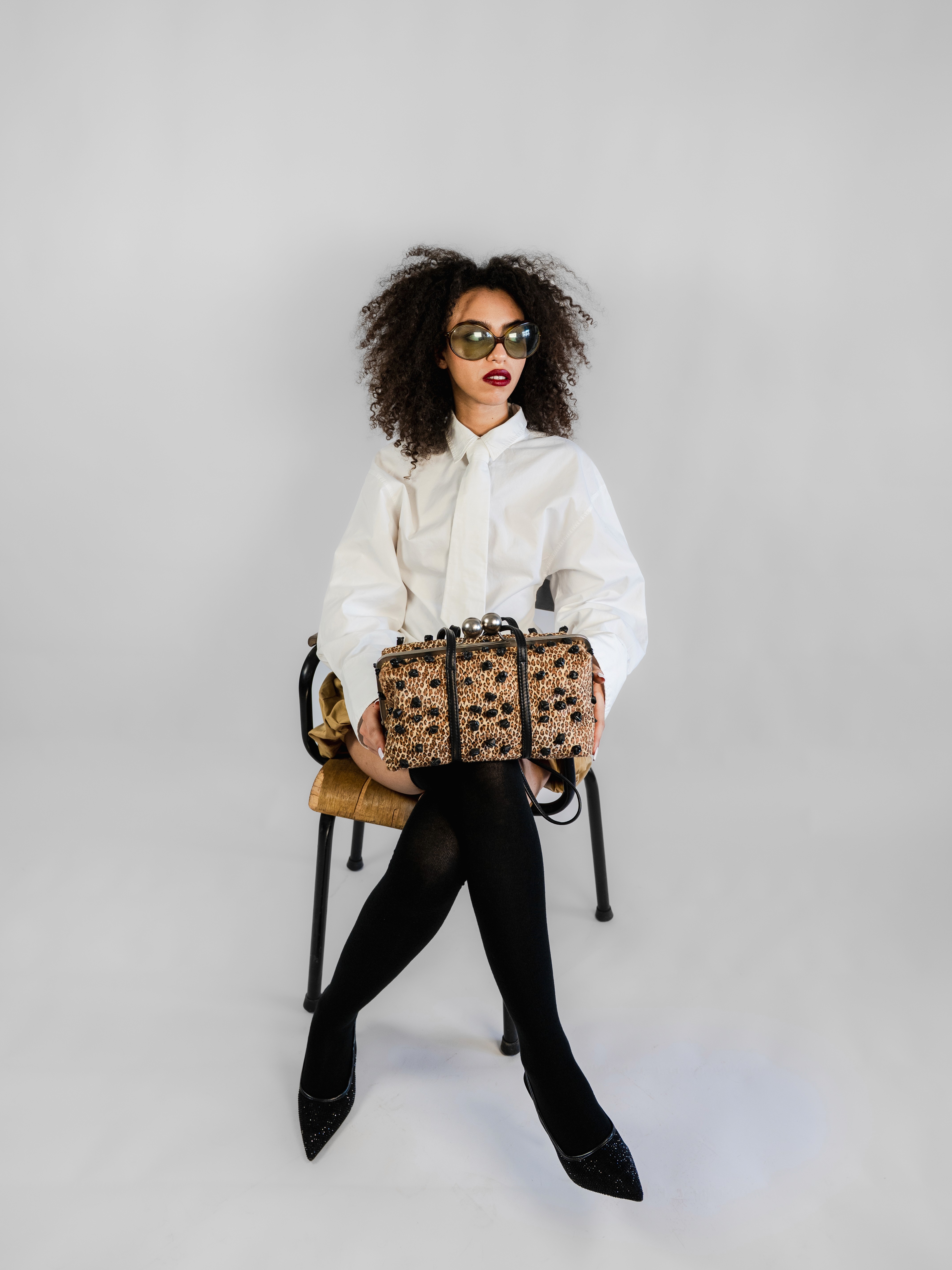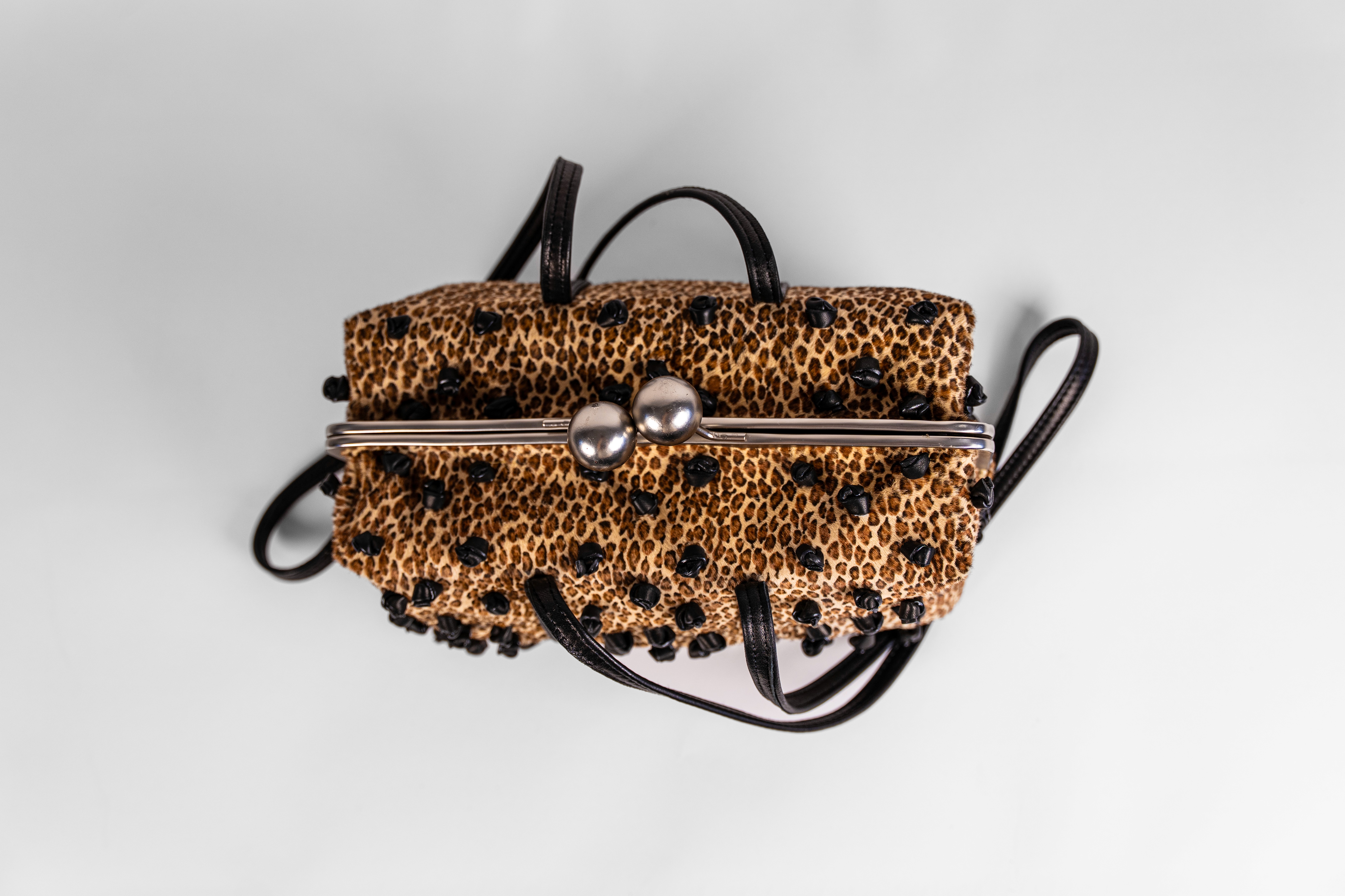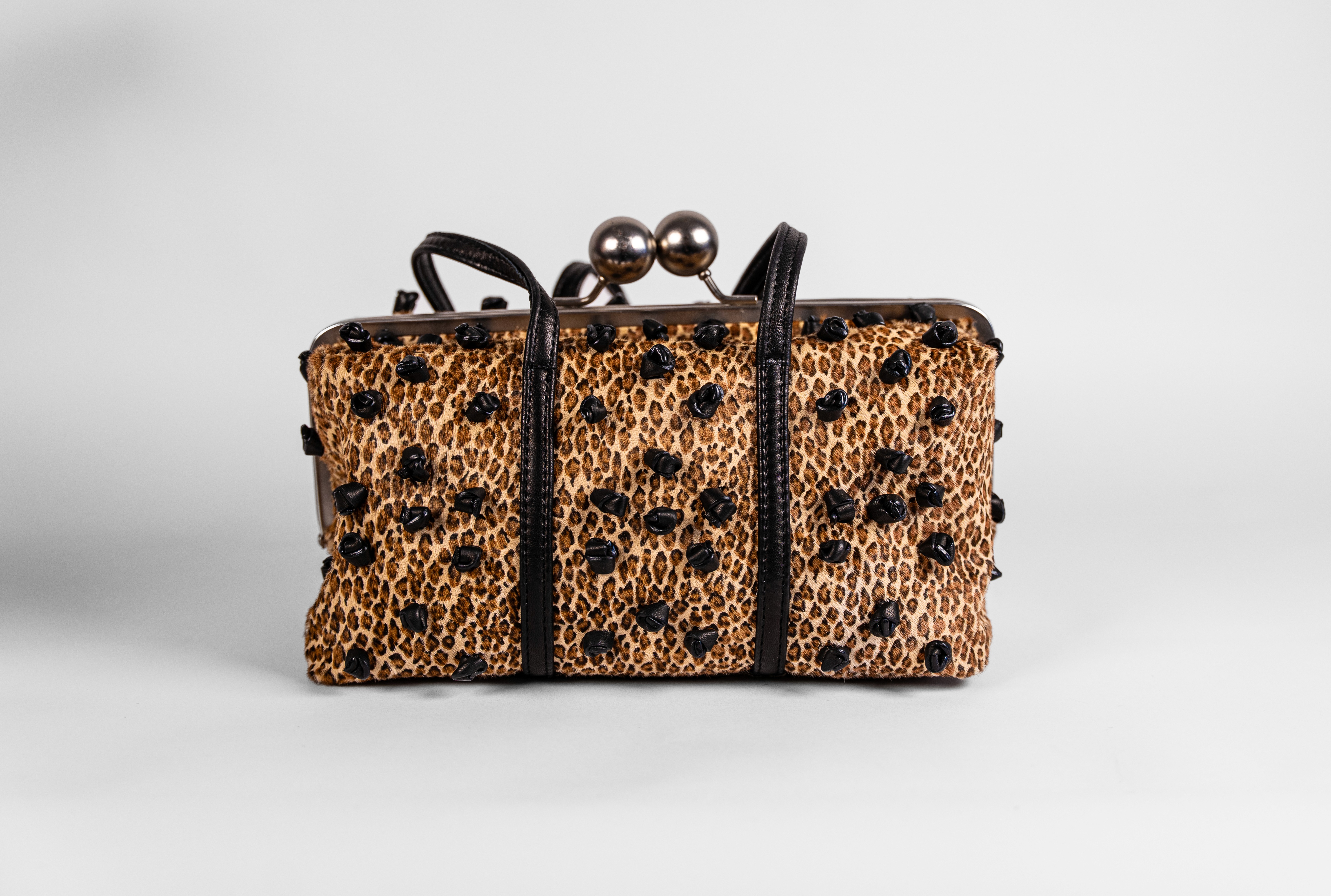 MATERIAL: Pony leather with a micro leopard print in shades of brown, black, and fawn. Adorned with hand-tied black nappa leather knots, each applied one by one, echoing the long, slim handles. Semi-matte silver-tone metal clasp with oversized spheres. Protective silver-tone metal feet at the base. Ecru nappa leather lining with a patch interior pocket. DETAILS: Structured yet supple silhouette, balancing definition and softness. Signature kiss-lock closure crowned with two oversized spheres, allowing the bag to be effortlessly grabbed in one swift gesture. Long, fine shoulder straps for an elongated, elegant carry. CARRIED: Worn over the shoulder with a long drop. DIMENSIONS: 280x 160 x 120 cm WEIGHT: 900gr